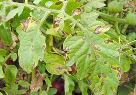 The disease known as Early Blight or Target Spot (because of the concentric circles within the spot) is one of the most common and harmful diseases that affects tomatoes. It can infects stems, leaves and fruits. It may sometimes, although rarely, affect seedlings causing damping-off in the seedbed. Early blight in tomatoes, first becomes evident on the laves of plants. Brown circular spots are often surrounded by a yellow area. Leaf spots usually appear on the oldest, bottom-most leaves first and progress up the plant. As the disease progresses, the fungus may infect the stems, blooms and even fruit.